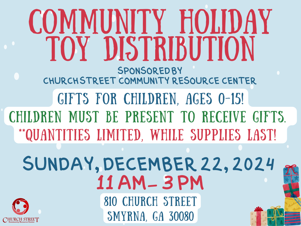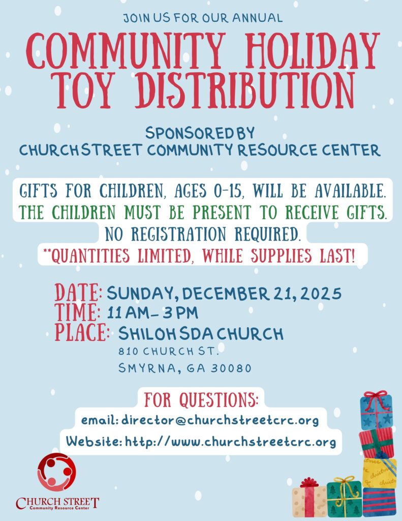 All are welcome to our Community Holiday Toy Distribution on Sunday, December 21, 2025 from 11AM to 3PM at 810 Church Street SE, Smyrna, GA 30080, sponsored by the Church Street Community Resource Center (CSCRC). FREE TOYS will be distributed to children ages 0-15. One gift per child. Children must be present. Quantities are limited,…